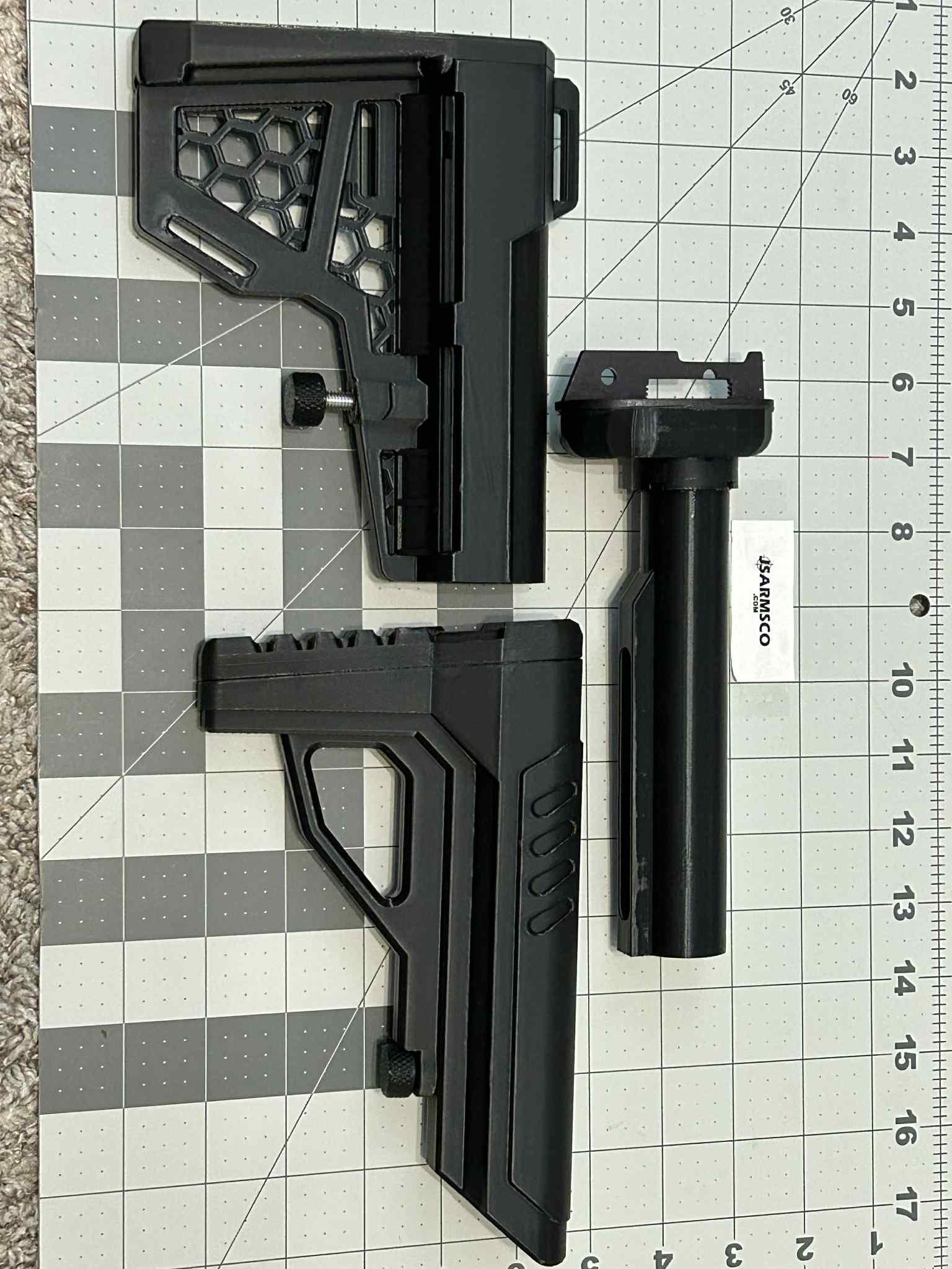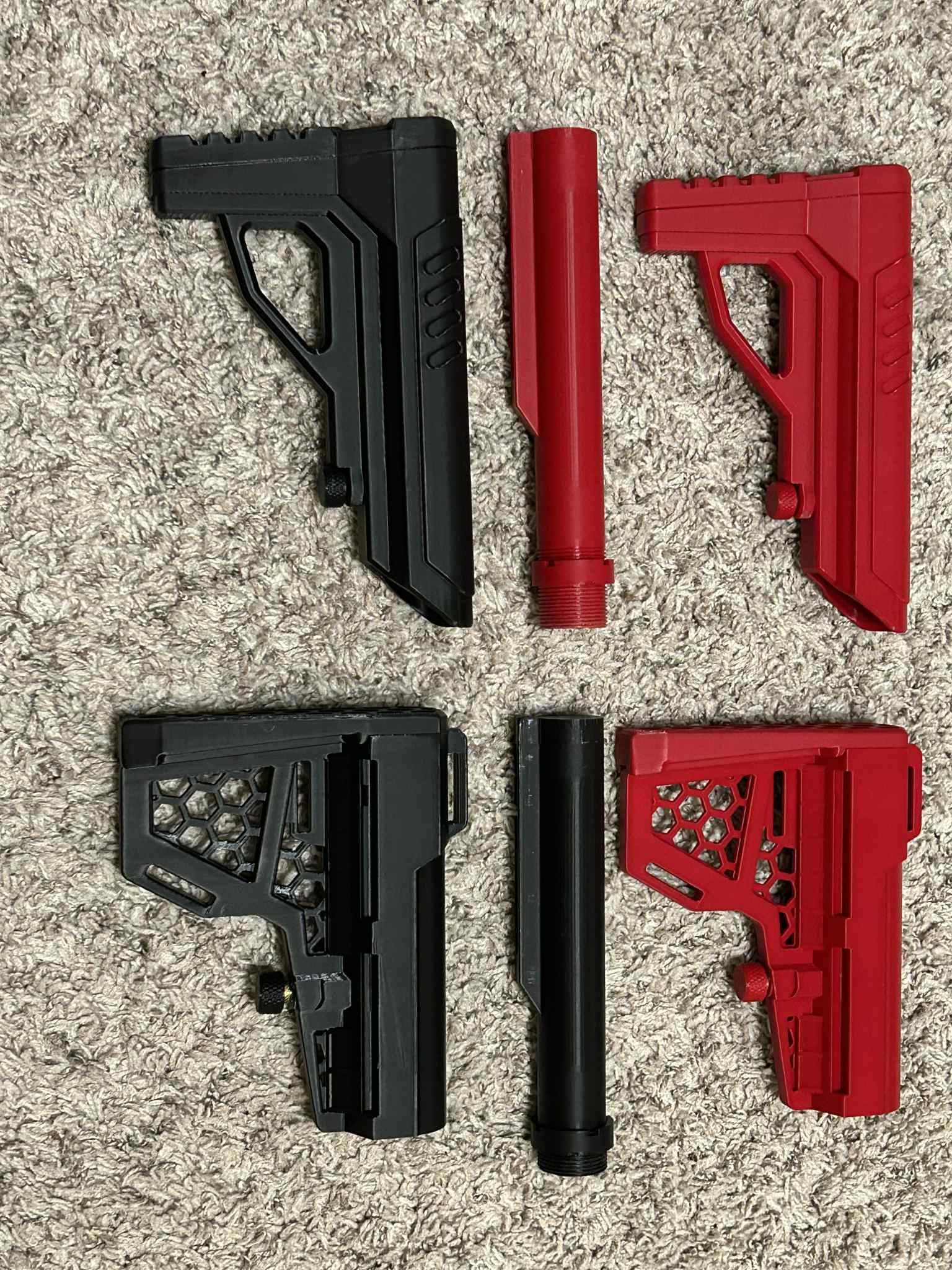 - 3D printed AR style buttstock with thumb screw adjustable to 6 positions - 2 styles and 2 colors to choose from.
