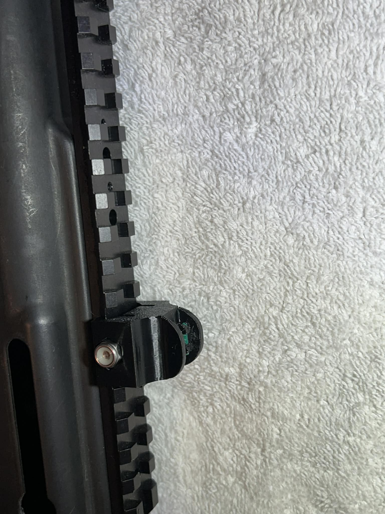 - Rear Sight has protective wings to keep fiber optic safe: Remove the Large (Golden Gate) OEM rear sight and leave the OEM rail attached to the shroud. Slide on the picatinny new rear sight and attach with the provide screw and locking nut. You will need to sight your carbine in adjusting front sight the screw until you are happy with shot placement.