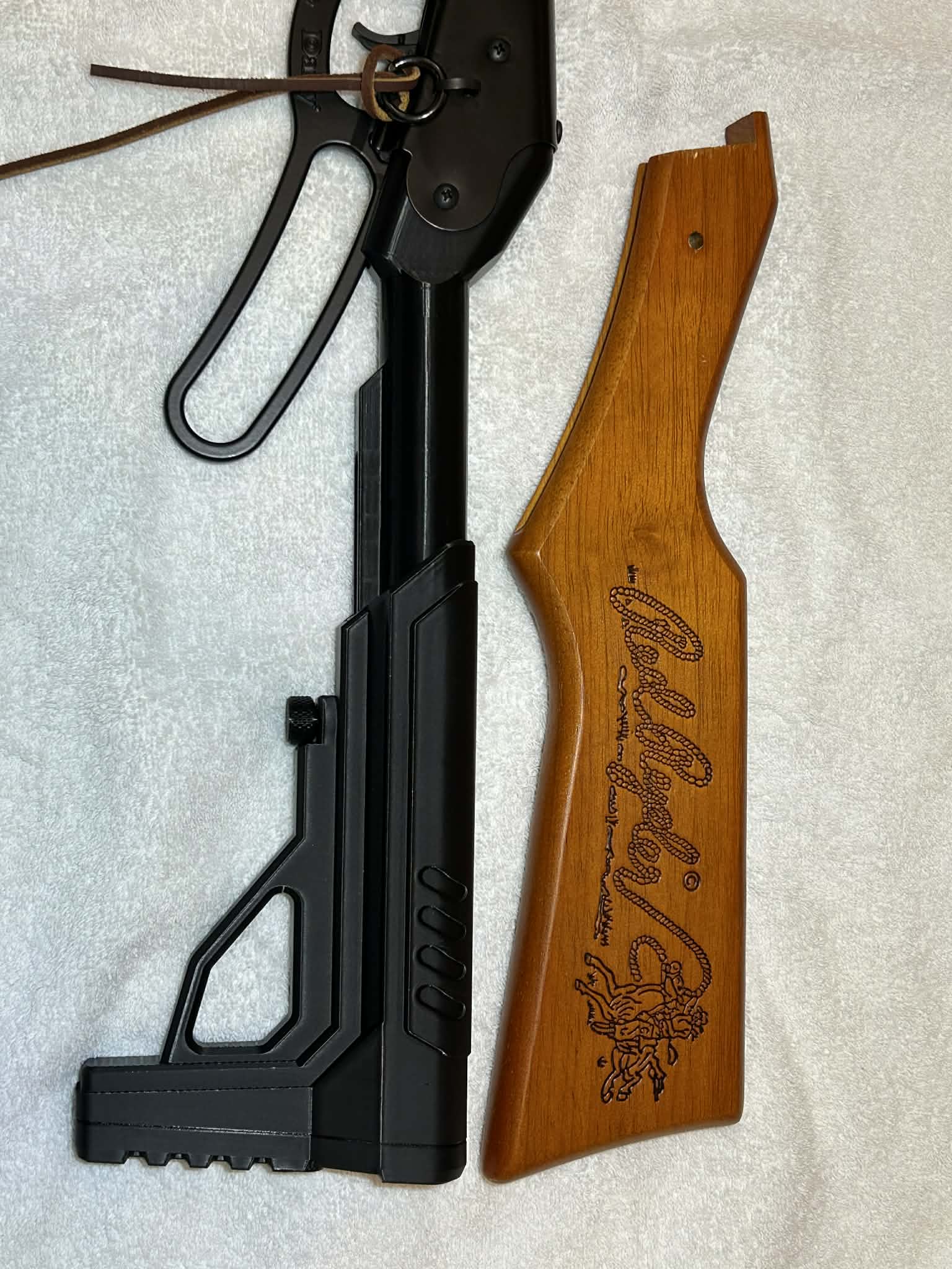 No modifying the OEM Red Ryder, you simply remove the screw at the top of the buttstock and the bolt and nut in the buttstock. Insert the new AR buffer tube stock and replace the screw and Nut and bolt.